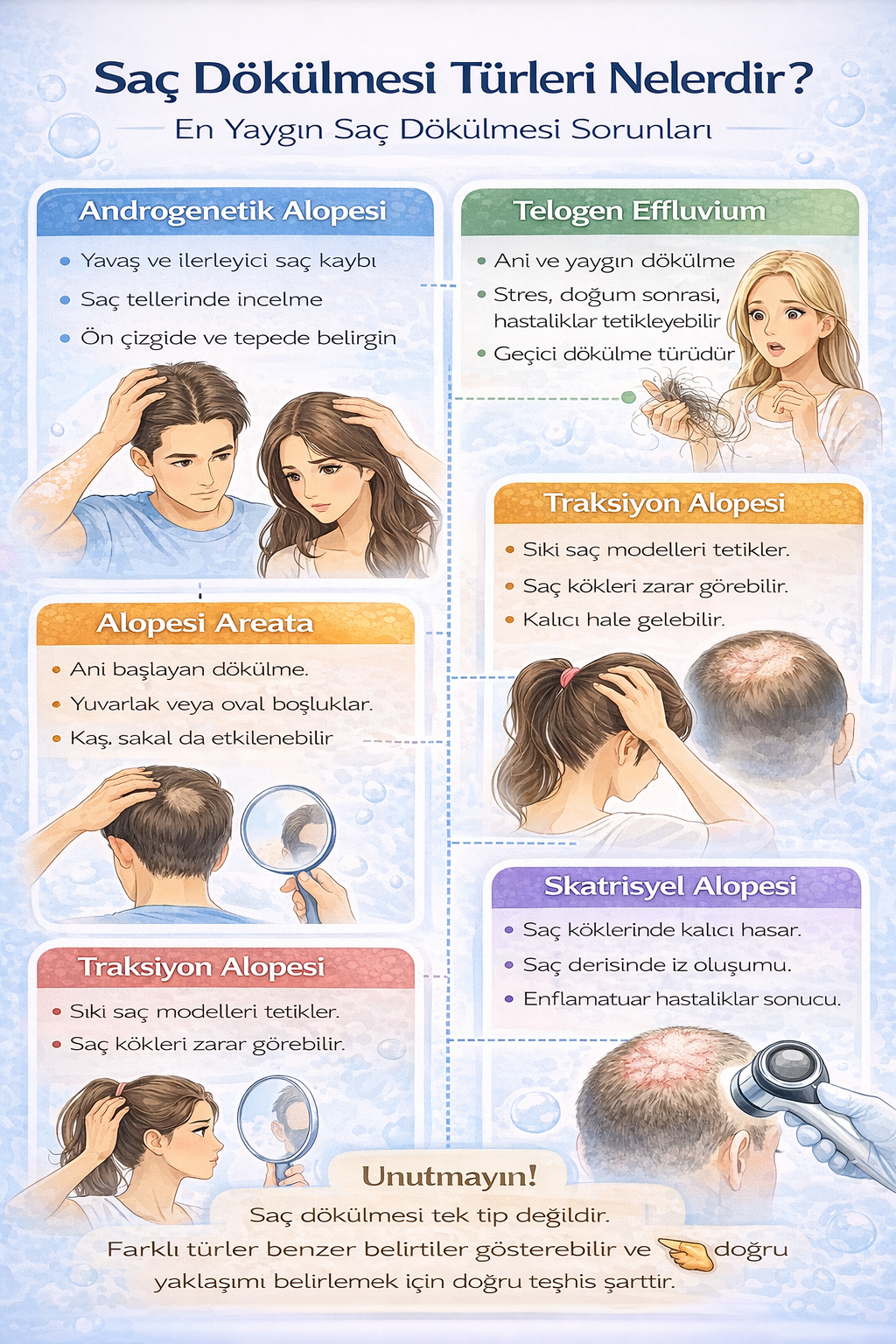 Bu içerik genel bilgilendirme amacıyla hazırlanmıştır. Saç dökülmesi türleri kişiye özel olabilir. Tanı ve tedavi için mutlaka uzman bir sağlık profesyoneline danışılmalıdır.