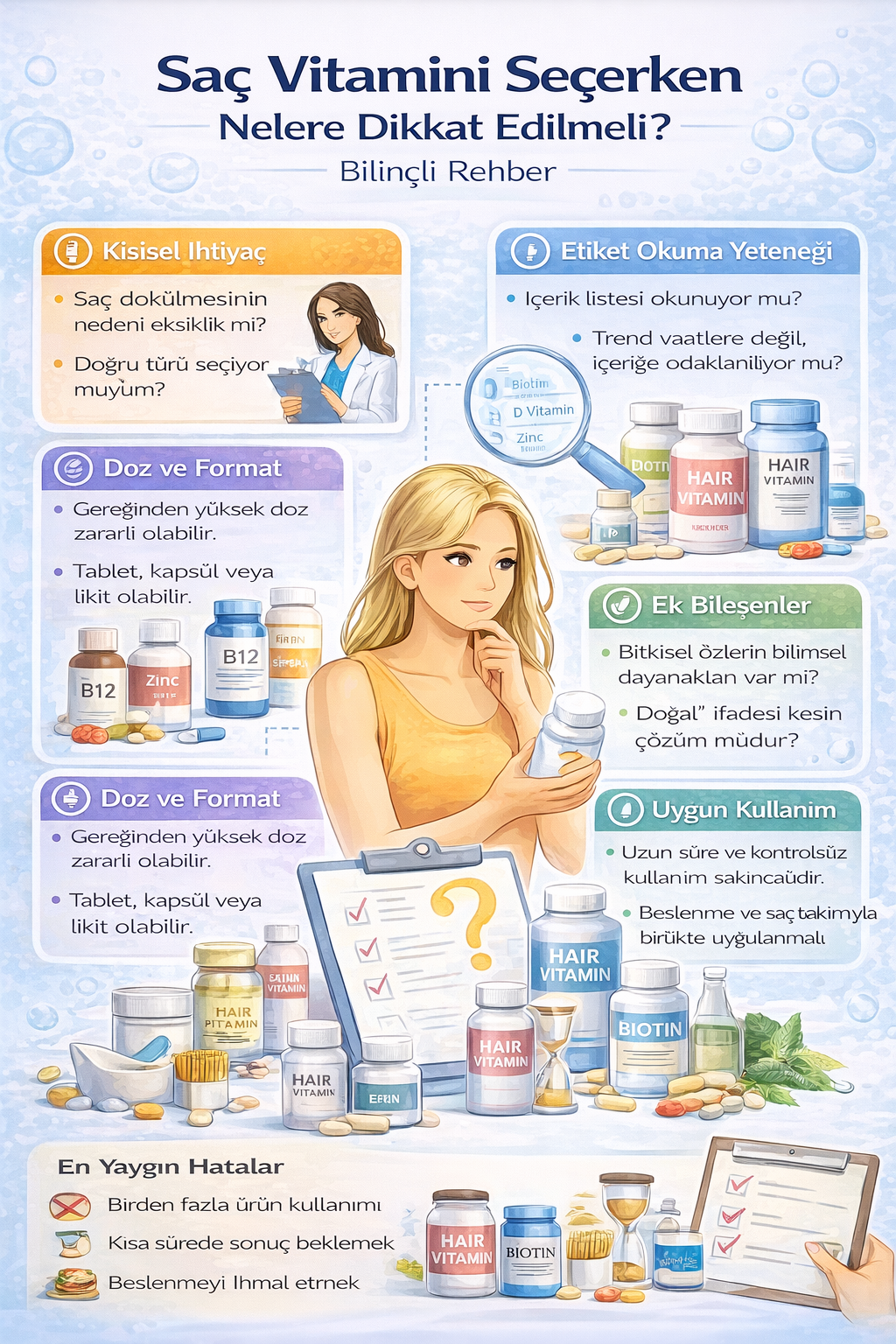 Özet: Saç vitamini seçerken reklamlara değil, içeriğe ve kişisel ihtiyaçlara odaklanmak gerekir. Bilinçli seçim, gereksiz kullanımın ve hayal kırıklığının önüne geçer. Saç vitaminleri doğru koşullarda destekleyici olabilir ancak mucize beklenmemelidir.